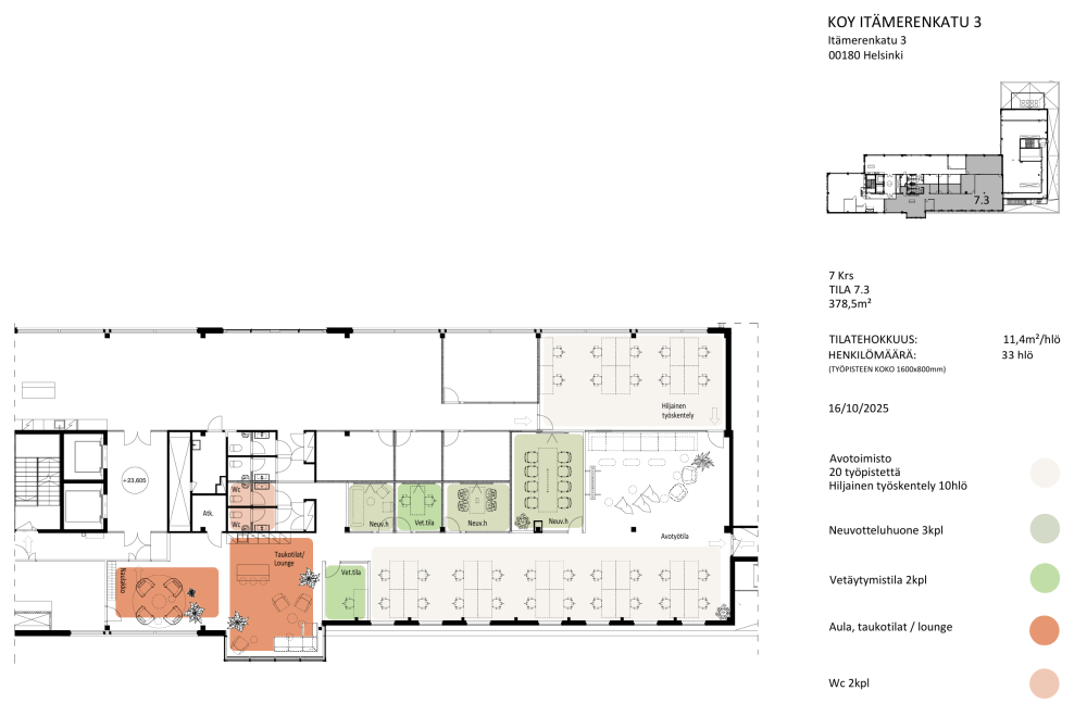 Itämerenkatu 3 on saneerattu täysin ja uudet korkealuokkaiset seitsemännen kerroksen tilat valmistuneet. Huippusijainti . Hyvät liikenneyhteydet. Pysäköinti parkkihallissa. Raitiovaunulinjan 8 pysäkki kiinteistön edessä ja Ruoholahden metroasema kävelymatkan päässä. Raitiovaunujen 6, 7 ja 9 pysäkit pienen kävelymatkan päässä.