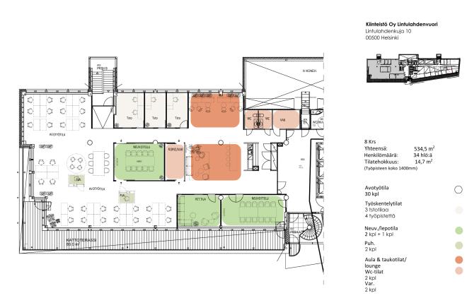 Isolla terassilla valoisaa ja tehokasta toimistotilaa ylimmässä 8. kerroksessa hyvillä kulkuyhteyksillä Lintulahdessa Sörnäisissä. Tästä toimitostilasta on näkymät neljään eri ilmansuuntaan. Tämä tila taipuu monelaisiin tilatarpeisiin ja räätälöidään asiakkaan tarpeiden mukaan. Vuokraan sisältyy yhteiskäyttöiset neuvottelutilat sisääntulokerroksessa. Lintulahden toimistotalo valmistui kesällä 2009 ja se sijaitsee Hämeentien ja Sörnäisten rantatien välissä. Hankkeelle myönnettiin ensimmäisenä Pohjoismaissa LEED® -ympäristösertifikaatti. Hyvien liikenneyhteyksien varrella. Kiinteistössä on lämmitetty autohalli ja katutasossa henkilöstöravintola sekä vastaanottopalvelut. Vuokralaisten yhteiskäytössä on lisäksi iso neuvotteluhuonekeskus kaikkine palveluineen. Suihkutilat pyöräilijöille, Cat6 - kaapelointi